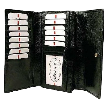 2 bill pockets, 14 CC, 5 side pockets, 1 ID pocket, 1 zipper inside, 1 coin pocket closed with zipper on outside |