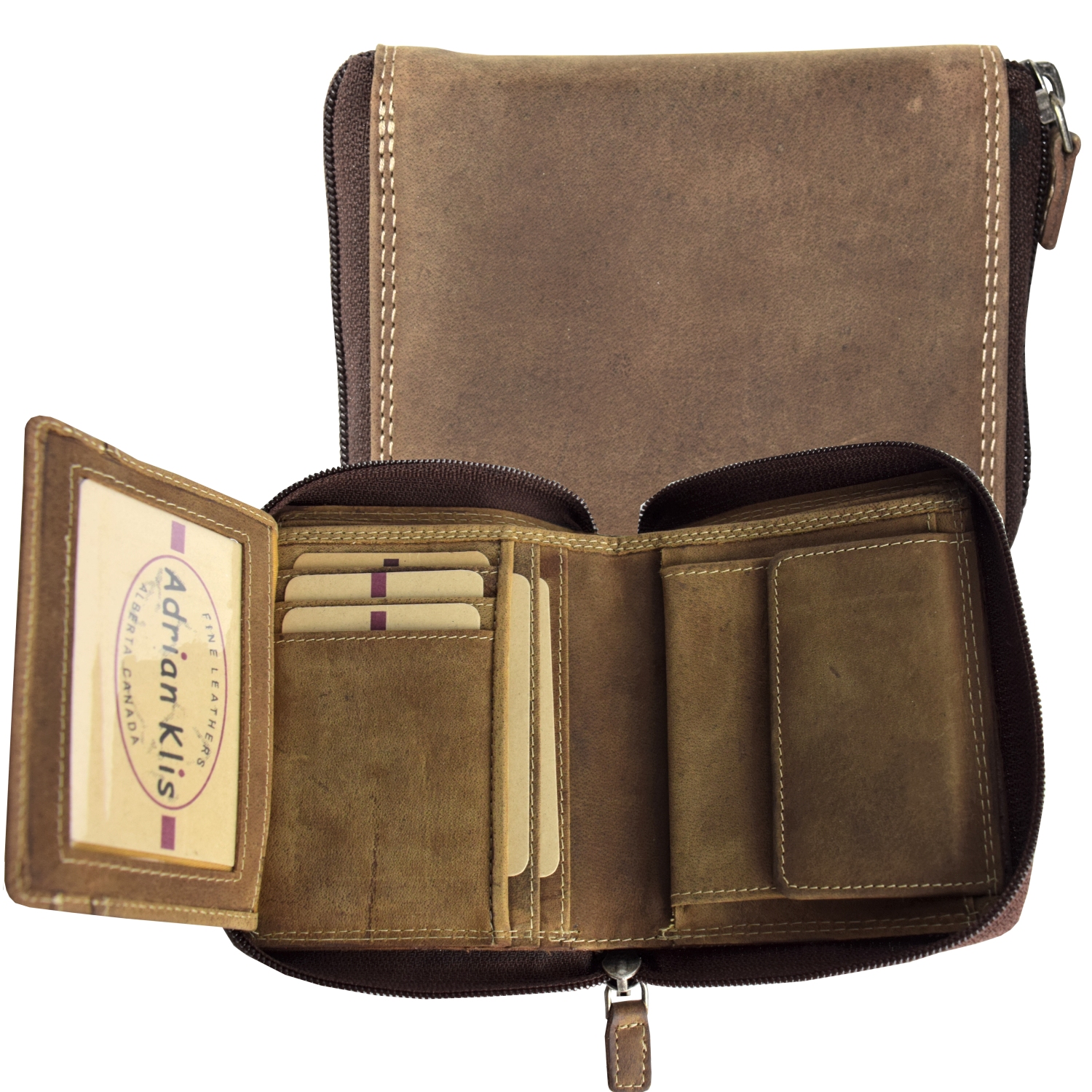 6 CC, 1 ID, 6 pockets, 2 bill pockets, closed with zipper around |