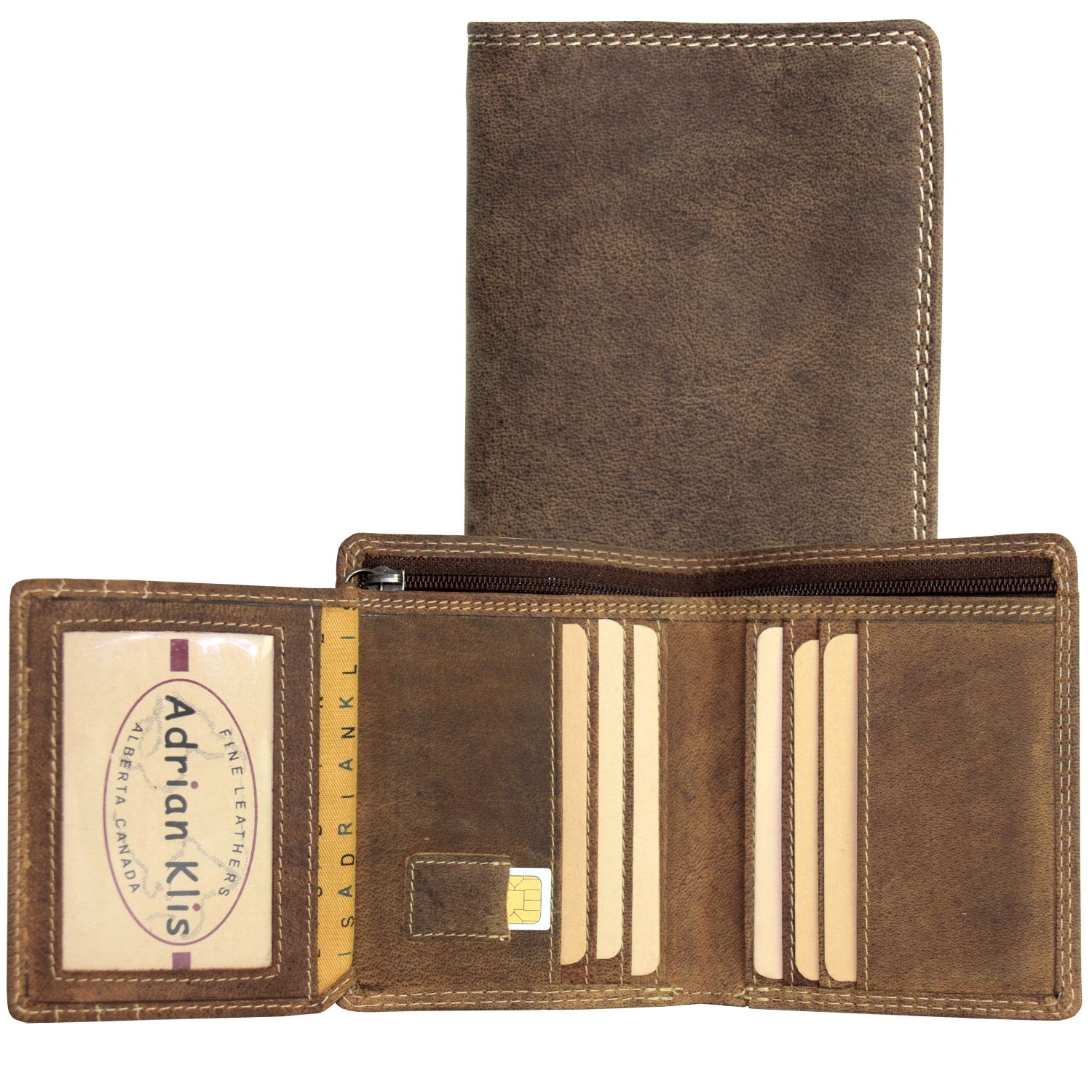 Inside: 6 CC, 1 smart card pocket, 3 open pockets, 1 pocket closed with zipper |