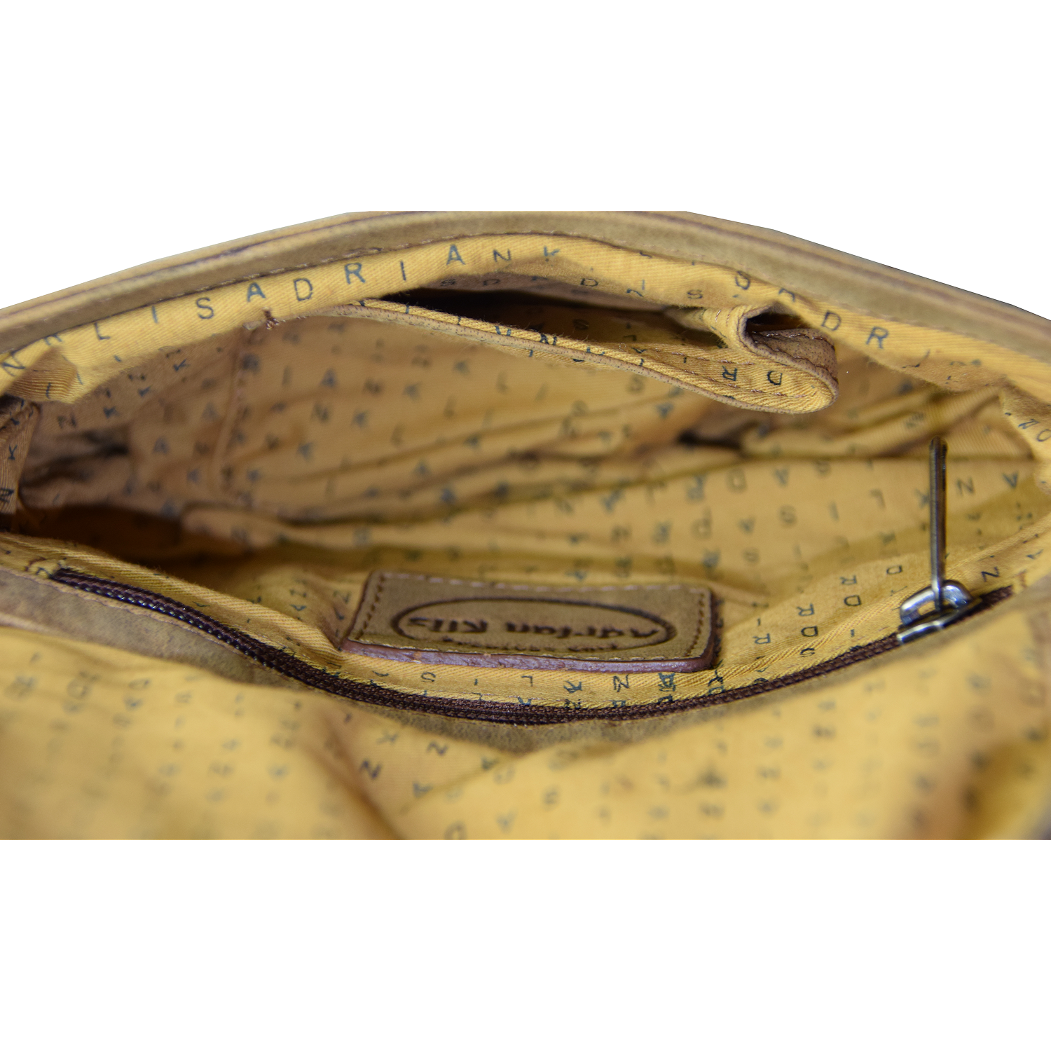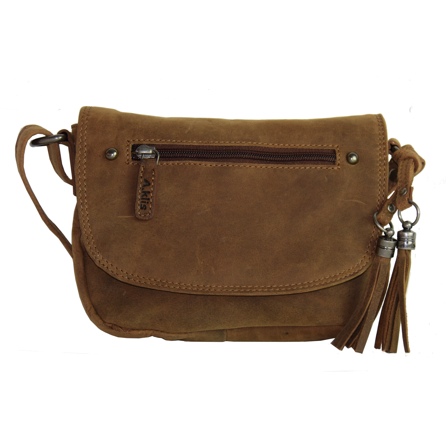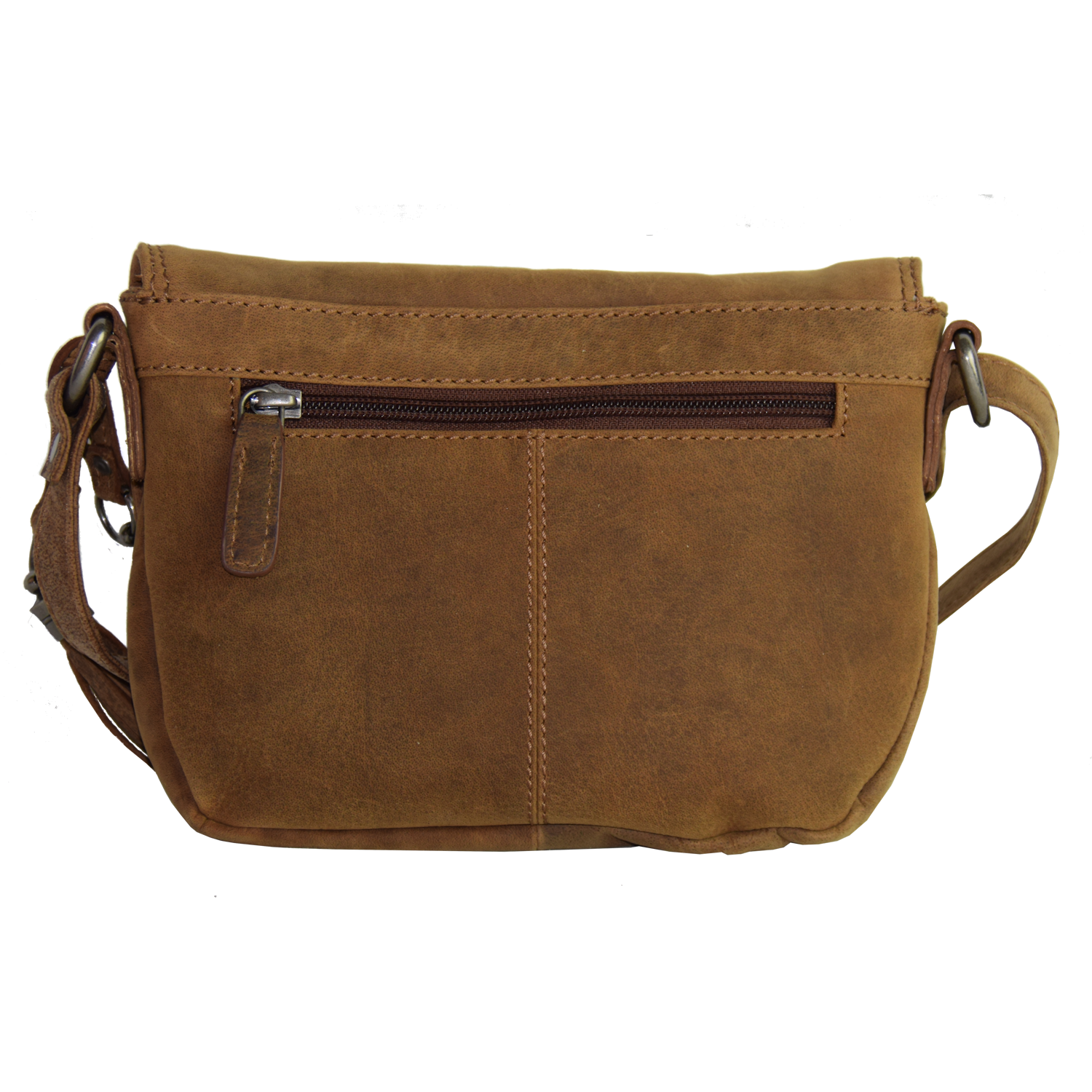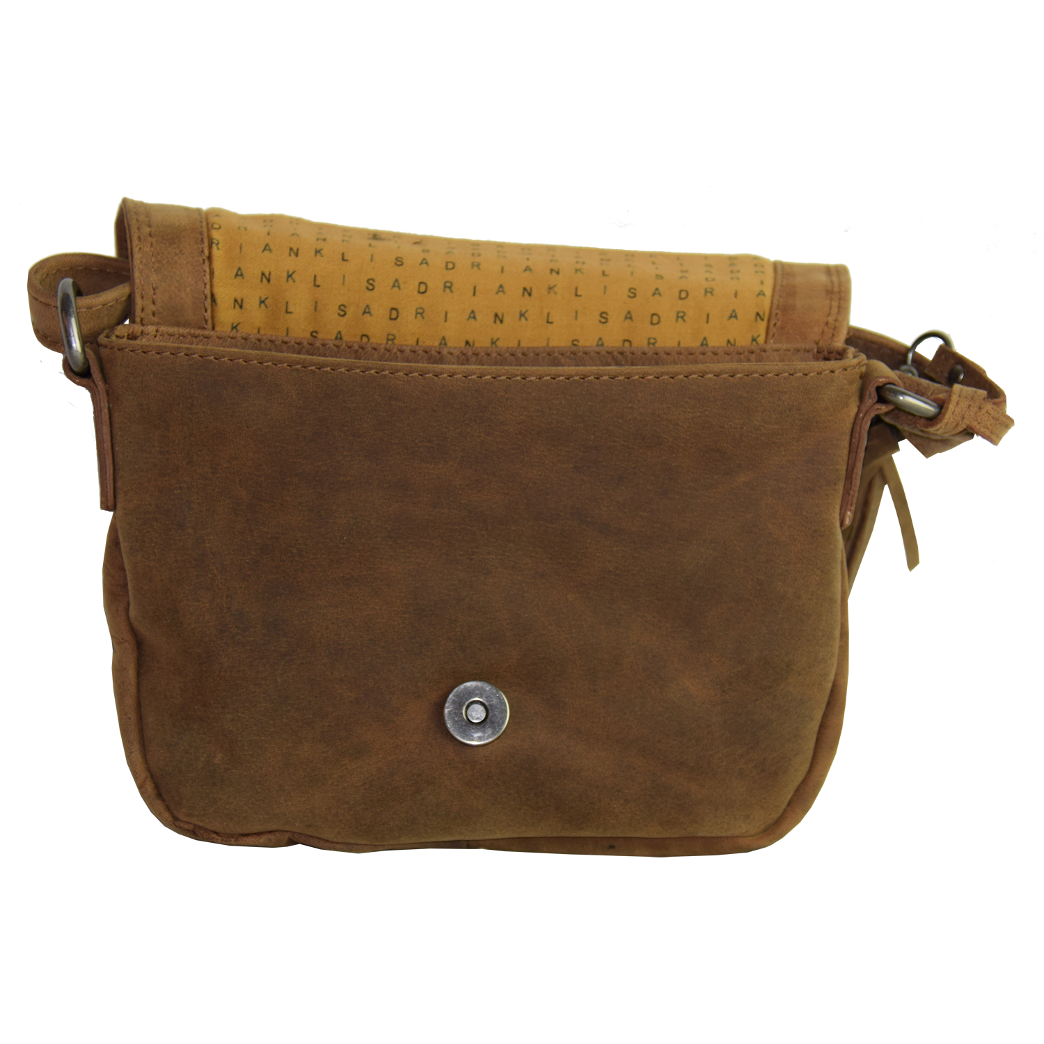 Adjustable shoulder strap, bag closed with flap and snap Front: 1 pocket closed with zipper Inside: 1 pocket closed with zipper, 1 open pocket Back: 1 pocket closed with zipper |