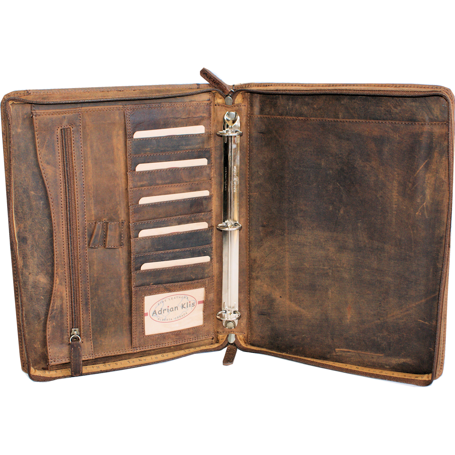 Front: 1 open pocket Main compartment closed with zipper Inside: 3 rings for binding (optional), 3 large open pockets, 1 pocket closed with zipper, 2 pen holder, 9 CC, 1 ID |