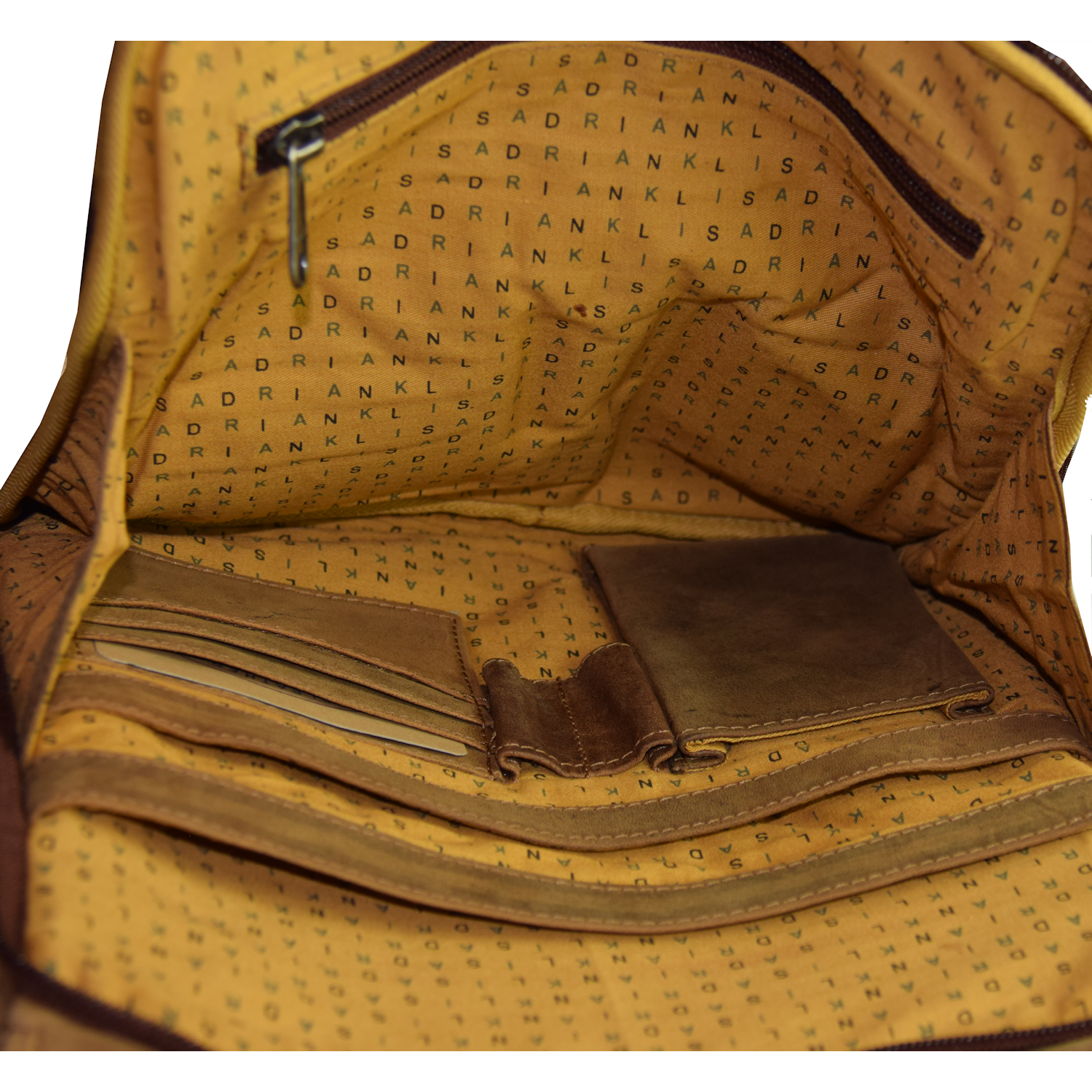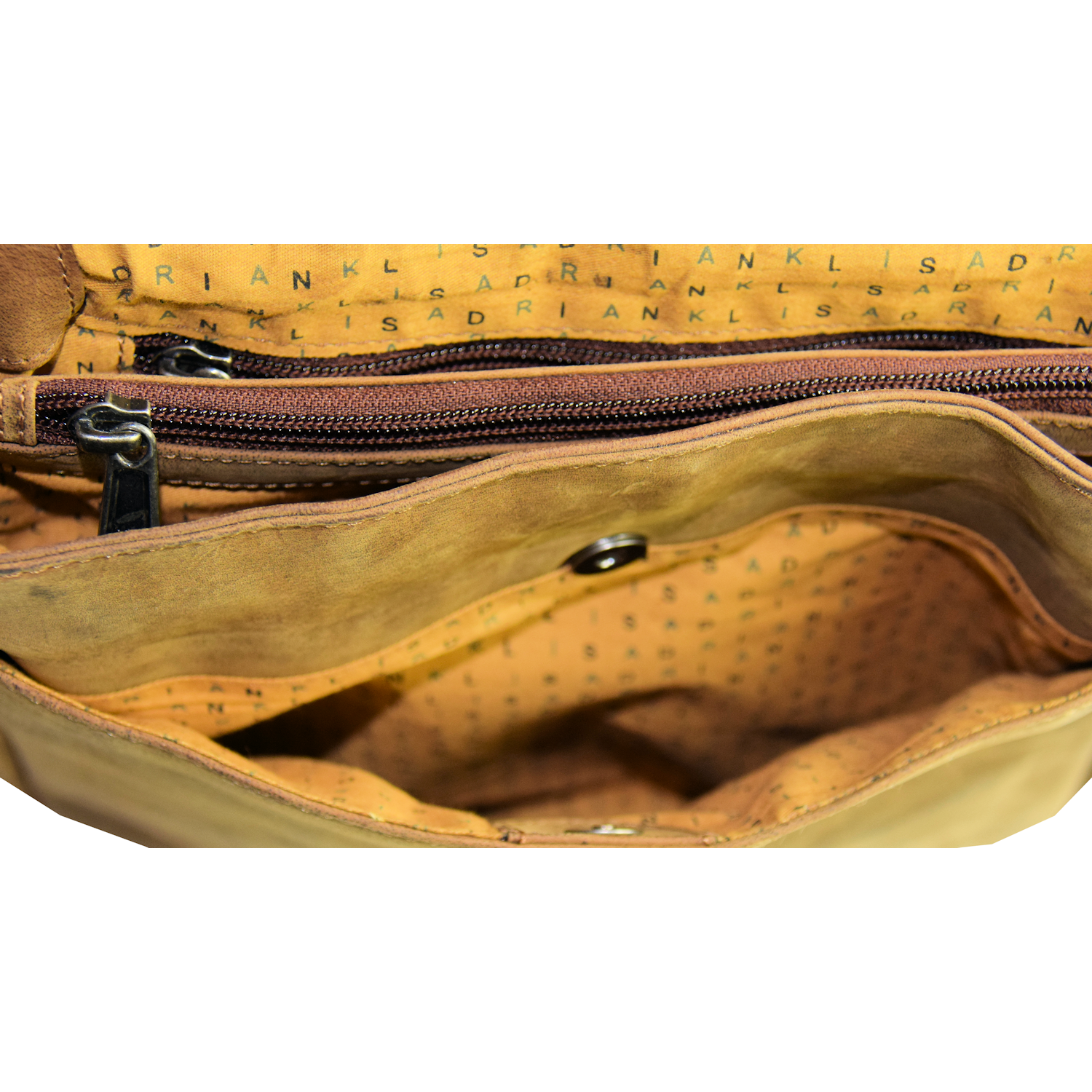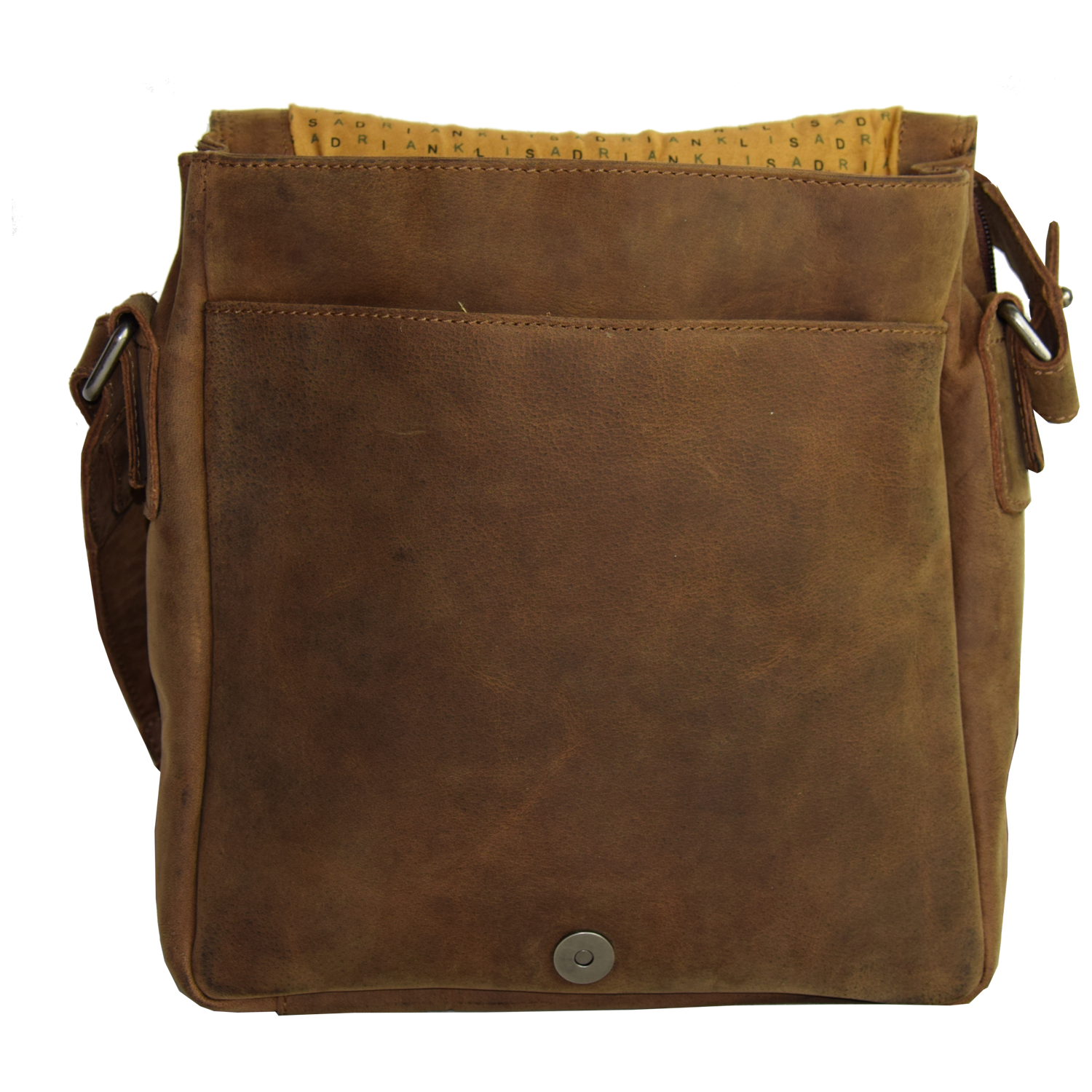 adjustable shoulder strap, closed with flap and magnetic snap Front open: 1 pocket closed with magnetic snap Inside: 3 compartments Comp. I: open pocket Comp. II: closed with zipper Comp. III: 1 pocket closed with zipper Back: Organizer pocket closed with 2-way zipper Inside: 1 pocket closed with zipper, 3 open pockets, 1 cell phone pocket, 2 pen holder, 3 CC |