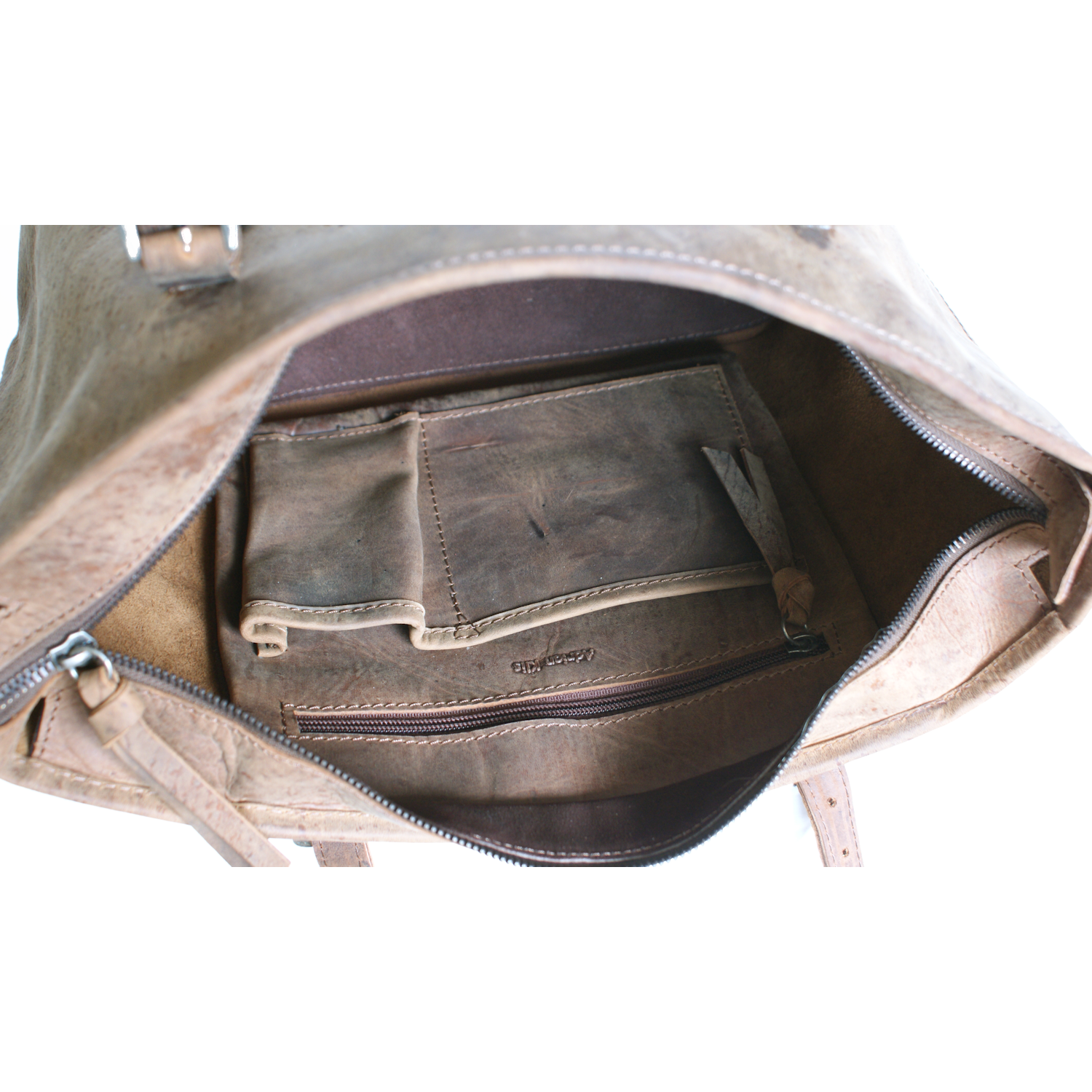 Bag has 2 handle and leather lining 1 key holder ring outside Main compartment closed with zipper Inside: 2 pockets and 1 open pocket Pocket 1 = 1 pocket closed with zipper, 1 cell phone pocket Pocket 2 = 1 pocket closed with zipper |