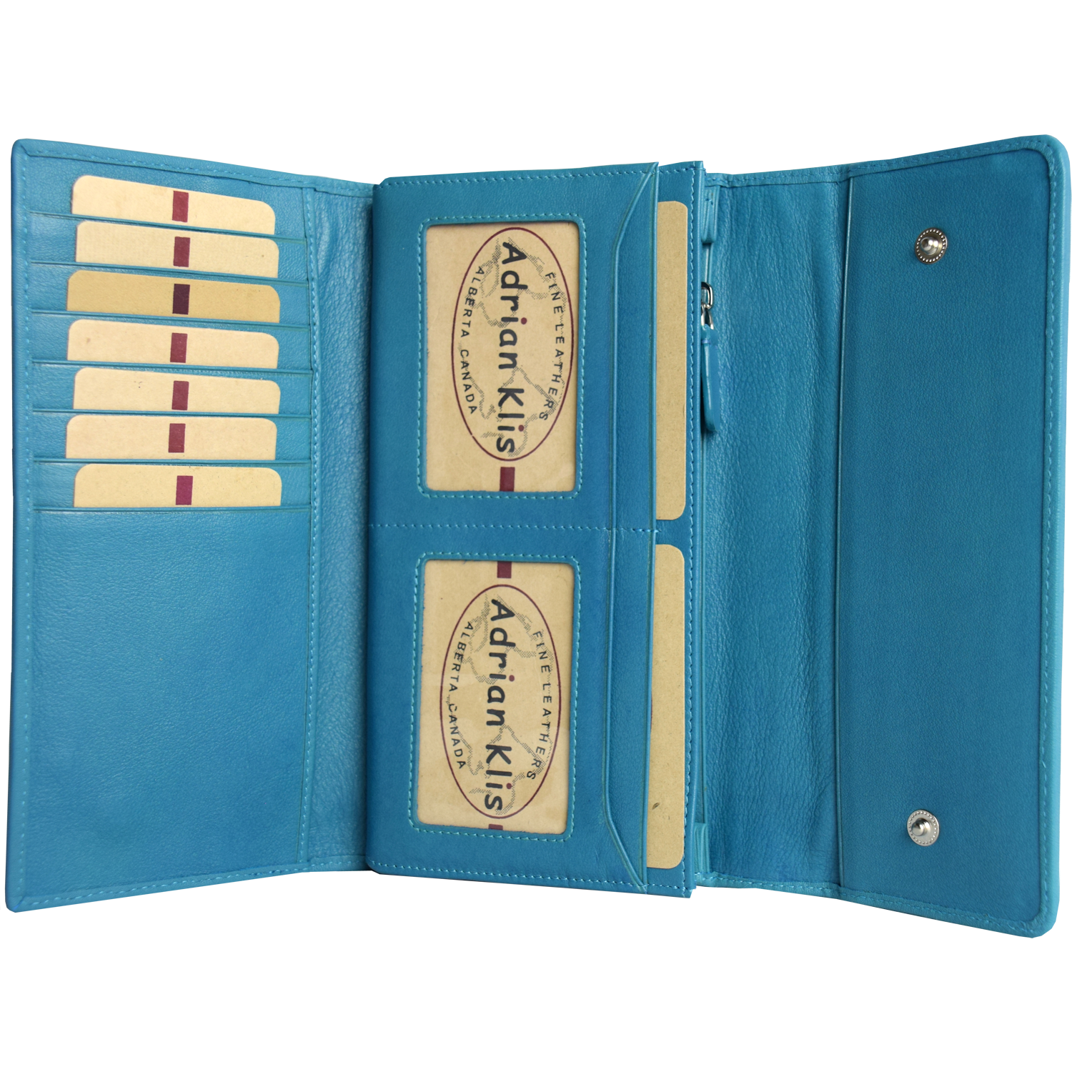 9 CC, 2 ID picture frame, 3 open pockets, 1 pocket closed with zipper